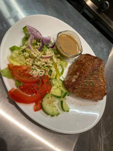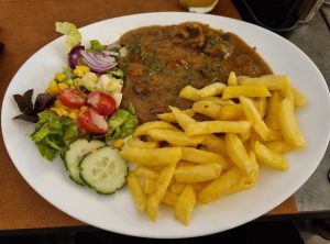 Bœuf mijoté à la bière brune, servi avec frites maison et salade.